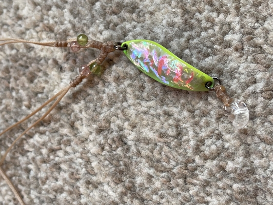 2026年02月16日 07時19分 お守りリメイク 釣り友のいるショップに行って久しぶりに近況交換♬ BUXの春を感じるかわいいルアーに目が留まりルアーとして使う前にチョーカーとしてリメイクすることに。 釣りのお守り用に。 水晶の勾玉やペリベット、ストロベリークォーツなどの石をチョイスしてチョーカー完成。 これハマりそう。ルアーは無限に模様やカラーバリエーションがあるので少しずつチャレンジしてみたいと思います(^^) コメント(0)