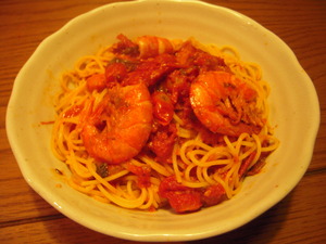 えびとトマトのパスタに。