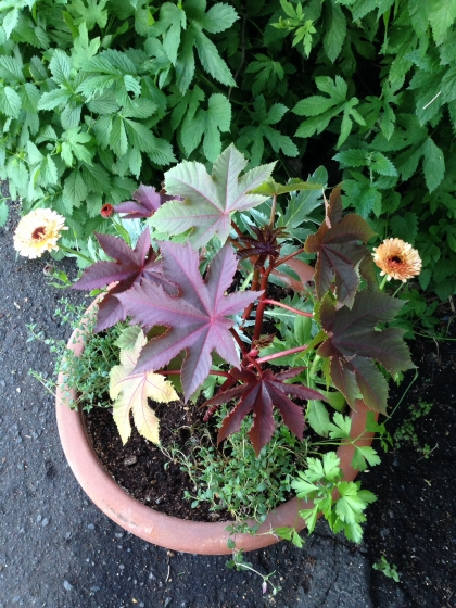 大きな鉢に寄せ植えを