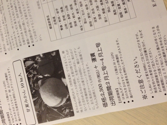 2015年01月16日 07時18分 楽しみに待つ〜 毎年、甘夏を頼んでいるきばるさん。 果肉がみずみずしくて皮も安心して使えます。 今年も甘夏を注文しました。 2月になるのが待ち遠しいです。 たくさん降った雪で住宅地内の道路は狭くて大変です。 ママさんダンプで捨てた雪がランドセルのように並んでいました(笑) きっと几帳面な人なんだな〜 おうちでスープカレー(^^) いつ食べても美味しいです。 コメント(0)
