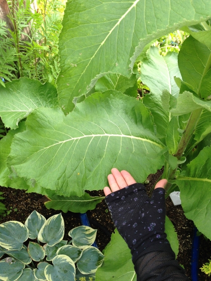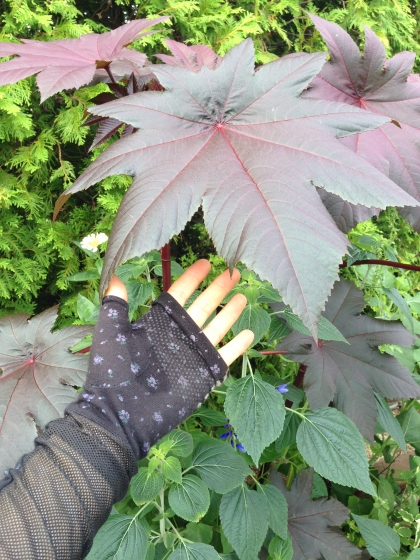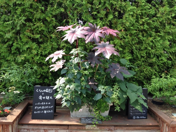 寄せ植えのヒマの葉も