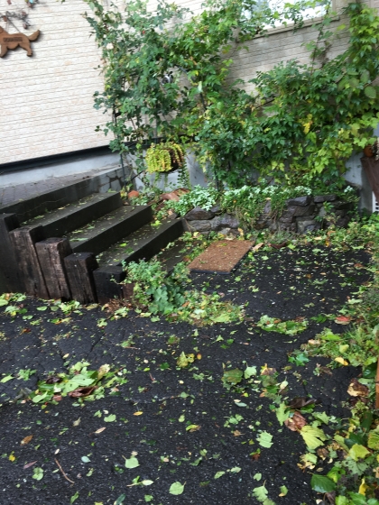 家の前はちぎれた葉っぱだらけになっていました。