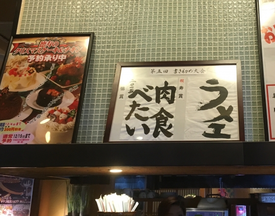 2015年11月26日 06時33分 どれだけ〜! ご挨拶はすごい雪ですね、が続いています。 国道はとりあえず路面は見えますが主要幹線道路は除雪が入っていないのでひどい状況になっています(≧∇≦) 除雪も雪遊びも頑張っているごほうびに(笑)焼肉ランチに行きました。 駐車場の除雪は手付かずの中、埋まって動けなくなっている小型乗用車を数人で押して労働p(^_^)qしてからの焼肉はおーいしー! しゃべる〜食べる〜締めはミニラーメン。 店内の壁にみつけた〜! レジ横にみーつけたーp(^_^)q コメント(0)