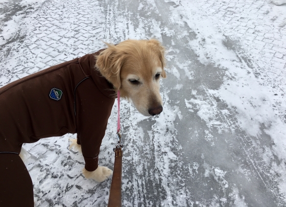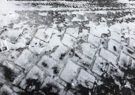 週末の暖気で緩んだ雪道、