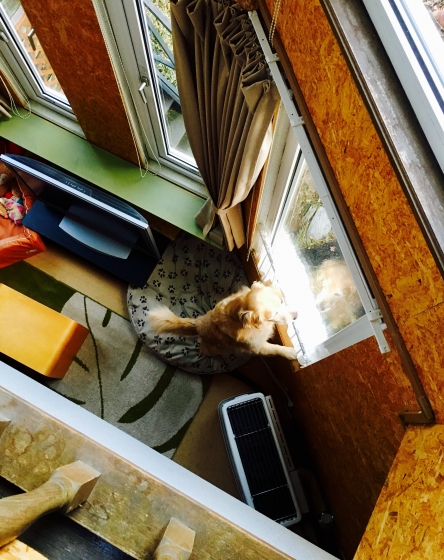 立ち上がり窓の外を眺めるラビを
