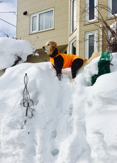 庭の雪山に登るのを