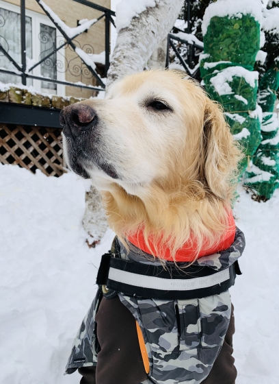 庭で雪の感触を確かめて