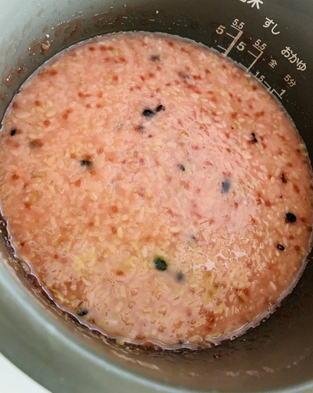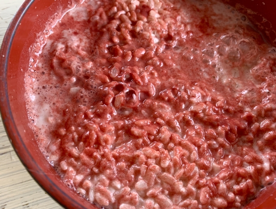 甘酒作りには紅麹、玄米麹をブレンドしています。
