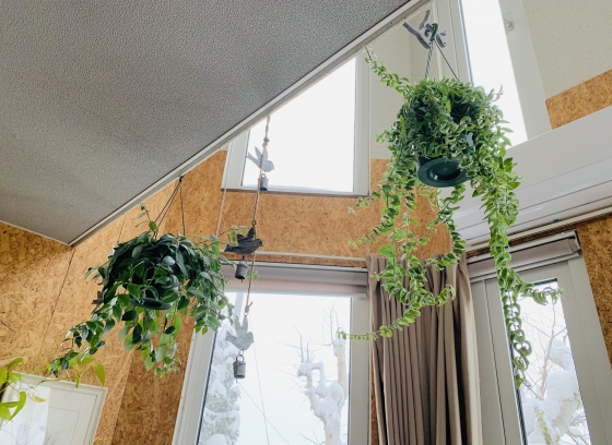 2020年12月28日 07時47分 冬将軍 連日の冷え込み、まさに冬将軍ですね。 窓の外が真っ白い景色になっていくと室内で恋しくなるのが植物。 庭から取り込んだハーブ鉢は「休眠」させるために一部屋非暖房にしてそこに置いてあります。居間に置くと間延びして見苦しくなるし休眠できないため春からの勢いが減ってしまうので この時期お役に立つのは観葉植物。 エスキナンサスを2種類、吹き抜けエリアに吊るしました。 あ〜これだけでかなりの癒し(笑) ねっ。ラビッヂ(o^^o) コメント(0)