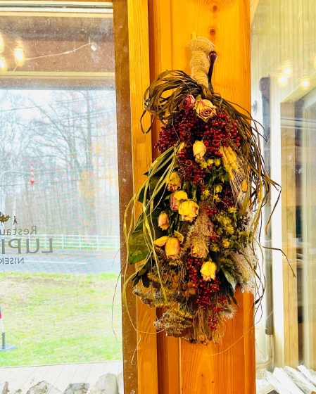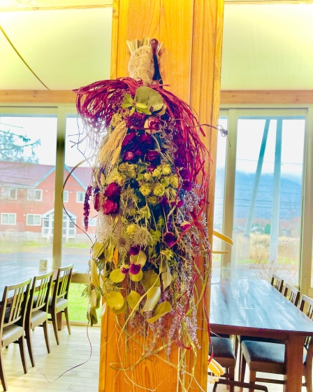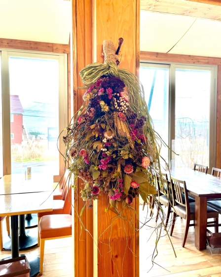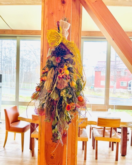 2021年11月30日 07時02分 ディスプレイ ニセコにあるヴィラルピシアのレストランにスワッグを飾ってきました。 レストランの店内の窓際柱にはスワッグを飾りました。 自宅で完成品をみるのと店内に飾ってみたのでさ光のうつりかたや壁色、素材が異なるので雰囲気が違いますね。 多少ビビットな色の紐リボンもちょうどなじんでいい感じでした。 リースもかざりましたので次回またアップしますね。 コメント(0)