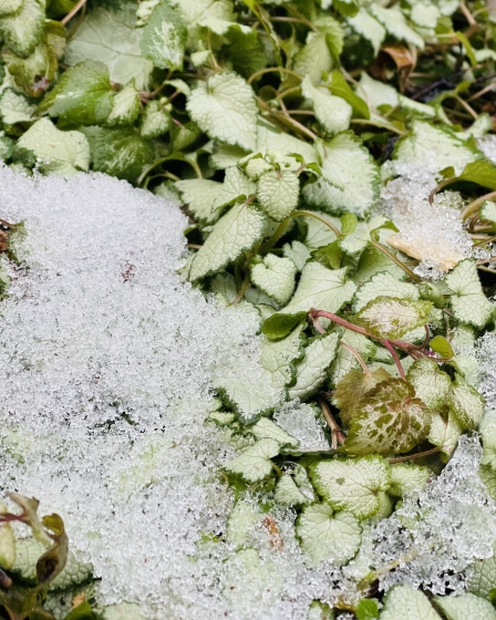 2021年12月16日 06時41分 根雪かな 氷点下の日もでてきましたね。 そろそろ根雪かな。 裏庭のラズベリーは先日の雪で凍結したようです。 ミントの葉はまだしっかり香りがします。 ラミウムは雪が降ってもこのまま。春に雪解けするとこのまま顔を出します。 零れ種で増えたかわいい芽も雪の下で冬眠。 春のかわいい水色の小花が楽しみです。 明日から荒れる予報(°▽°)気をつけましょうね。 コメント(0)