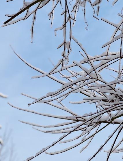 窓から雪コーティングの枝を