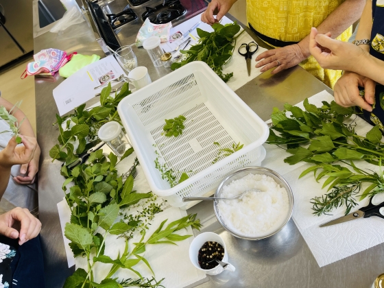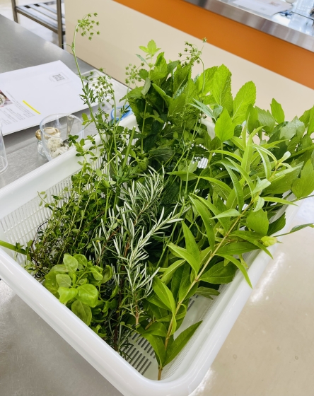 ハーブの香りに包まれる調理室で
