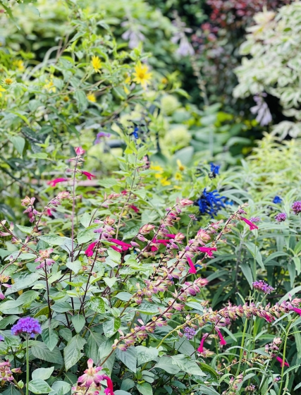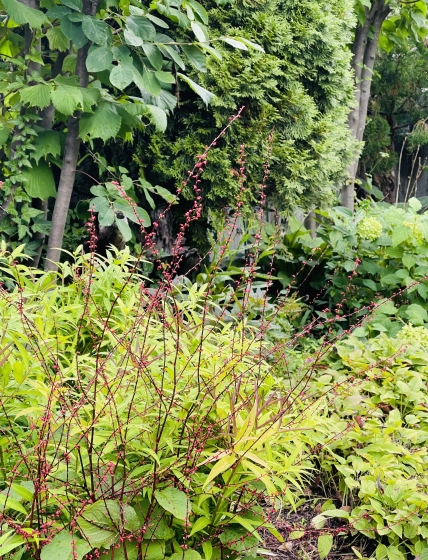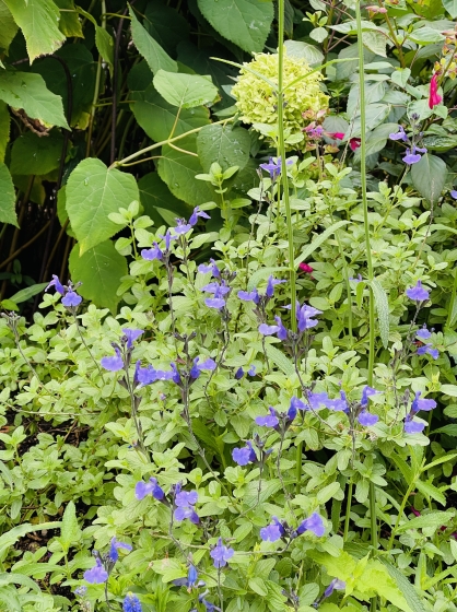 2025年08月26日 07時49分 夏の終わりの始まり 今年はカレンダーの日付と自然界から受け取る季節感のズレが大きなような気がします。 ハーブの花たちはまだ夏の終わり辺りにいる感じ。 セージ(サルビア系)の小花たちが生き生きと咲いています。 涼しくなってくると花色が鮮やかになってくるので色味の変化が楽しみです。 三尺バーベナも晩秋まで咲くので庭には欠かせない存在です。 ミズヒキの種がワンコたちの尾っぽの飾り毛に絡みついて庭中に種まきで大繁殖しているのを眺めて ワンコたちと過ごした庭時間を思い出しています。 コメント(0)