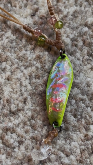 2026年02月16日 07時19分 お守りリメイク 釣り友のいるショップに行って久しぶりに近況交換♬ BUXの春を感じるかわいいルアーに目が留まりルアーとして使う前にチョーカーとしてリメイクすることに。 釣りのお守り用に。 水晶の勾玉やペリベット、ストロベリークォーツなどの石をチョイスしてチョーカー完成。 これハマりそう。ルアーは無限に模様やカラーバリエーションがあるので少しずつチャレンジしてみたいと思います(^^) コメント(0)