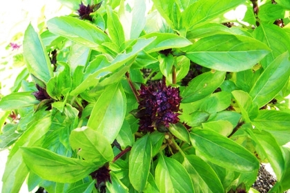 紫色の葉のバジルは大株になると色が抜けてくることもあります。色が濃いうちにお酢や焼酎に漬けるとルビー色に変身します。蒸し物の風味付けやドレッシングなどに使えて見た目も楽しめますよ。
