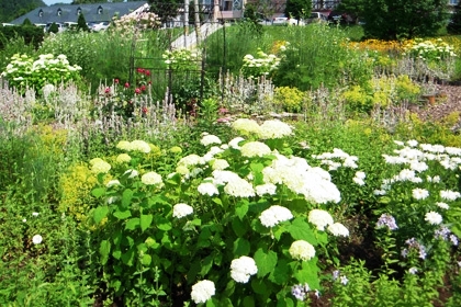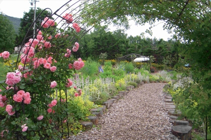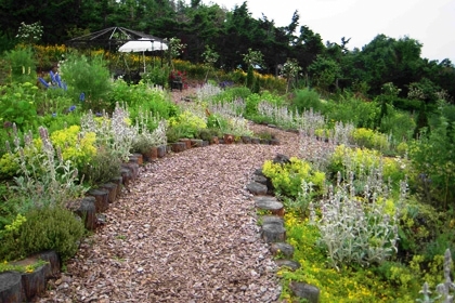 ラムズイヤー、アルケミラモリス、エキナセア、マロウ、 キャットミント、セージ、ヒソップ、バラなどたくさんのハーブが植えられていています。